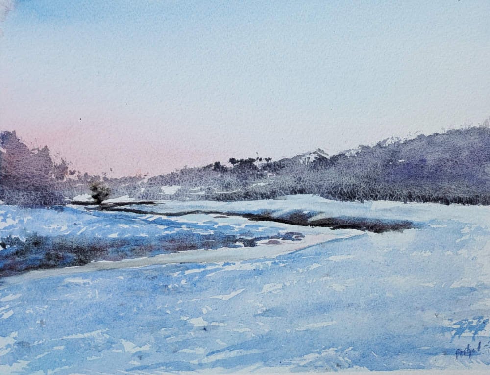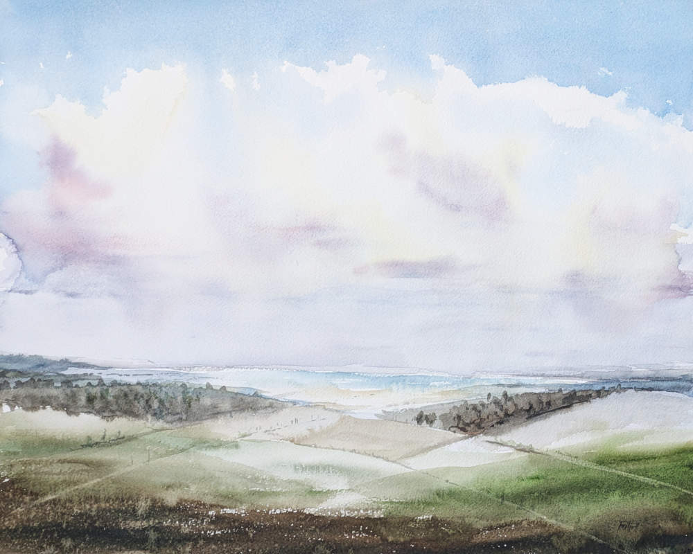 Utsikt från ladugårdsbacken på Stora Väsby i Östergötland. I privat ägo. Du är välkommen att höra av dig om du skulle vara intresserad av en akvarell med ett liknande motiv.