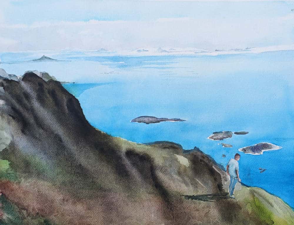Utsikt vid Lofoten. Vi har vandrat en led som närmast känns som klättring. Det är långt kvar till toppen men utsikten är ändå vidunderlig. Mått: 30 x40. Pris 3900 kronor., inklusive glas, ram och passpartout.