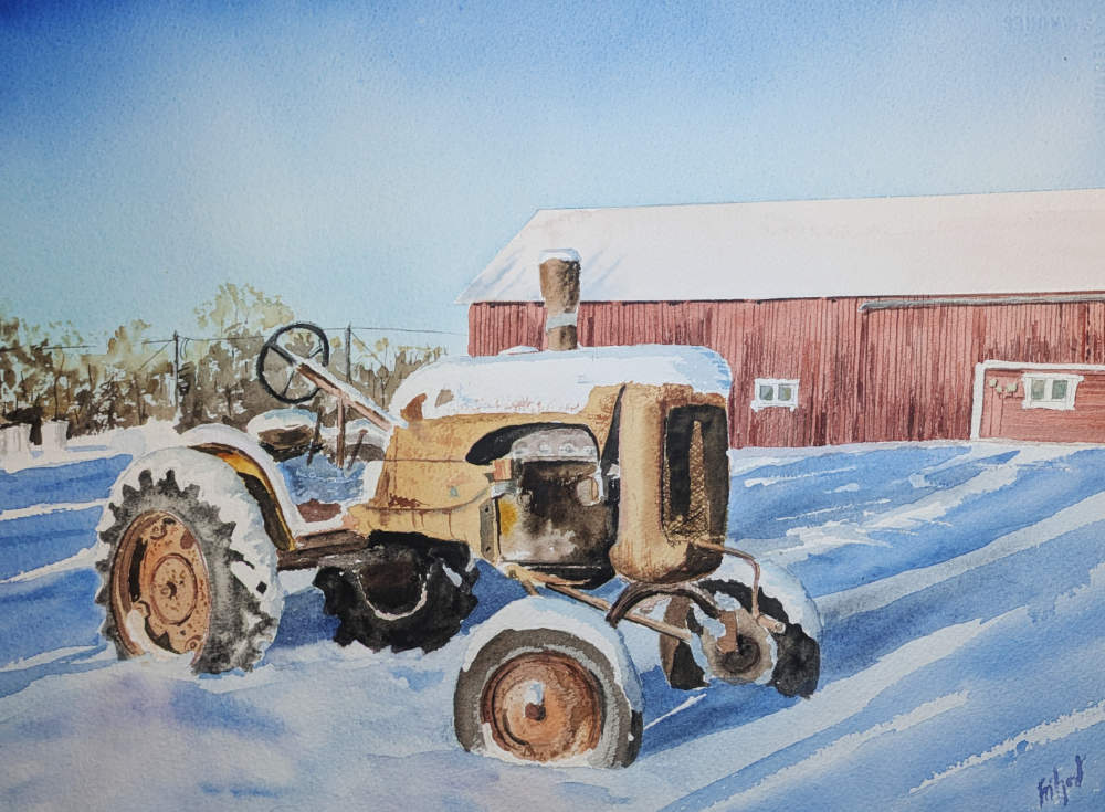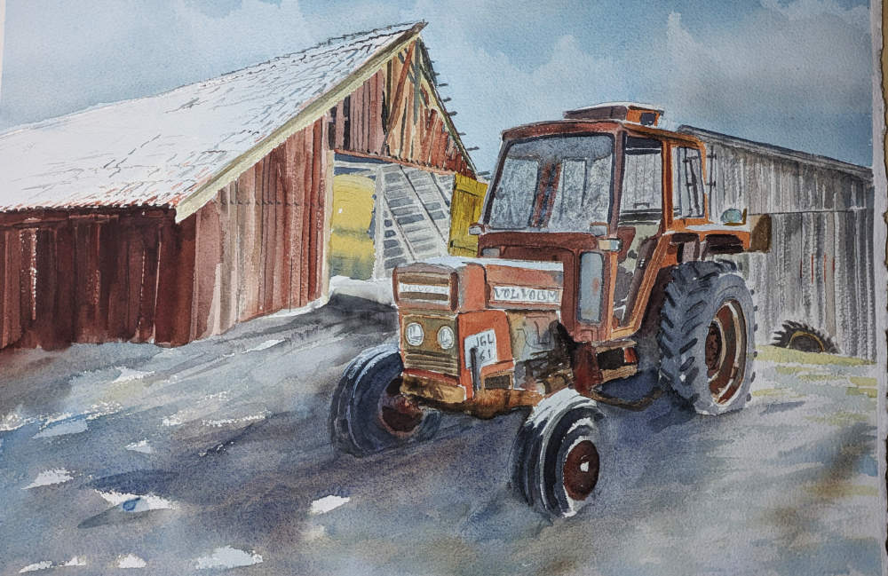 En Allis -Chalmers B. Att måla traktorer är nästan lika roligt som att köra dem. Eller nej… Det är roligare att köra. I en akvarell går det inte att återskapa vibrationerna från motorn, rycken från ratten utan servo och doften av olja och diesel. Men i brist på en traktor att köra så målar jag. Mått: 20×30 cm. Bilden är såld. Du är välkommen att höra av dig om du vill att jag ska måla en liknande tavla.