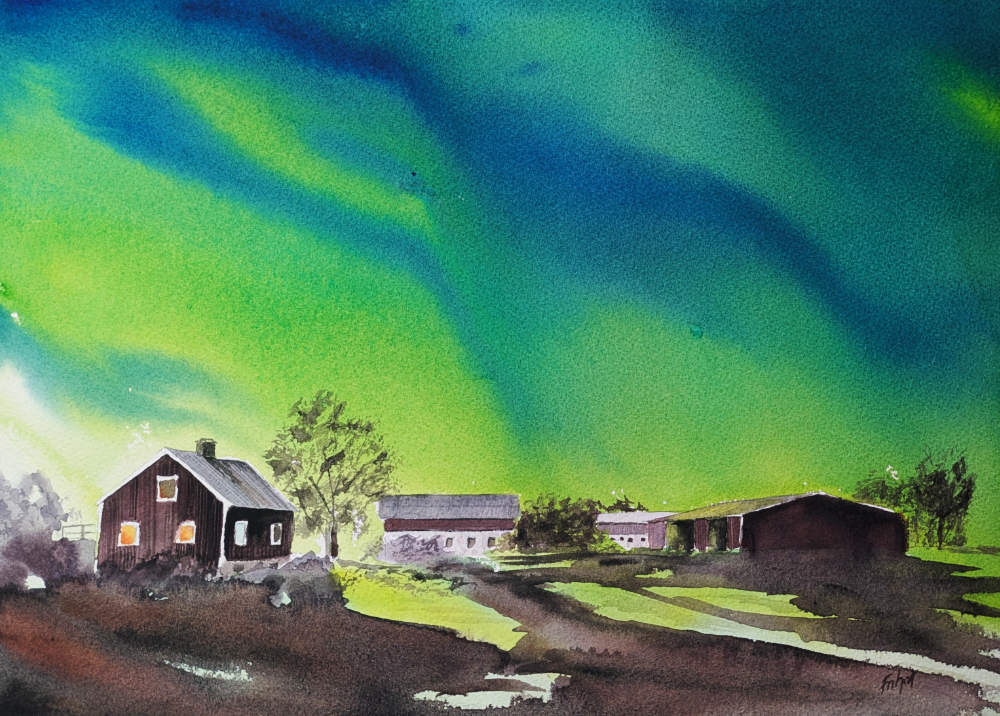 Norrskenet förvandlar den hemtama gårdsmiljön till en magisk plats. Mått utan passpartout är 30×40 cm. Pris: 3900 kronor. Inklusive passpartout, glas och ram.