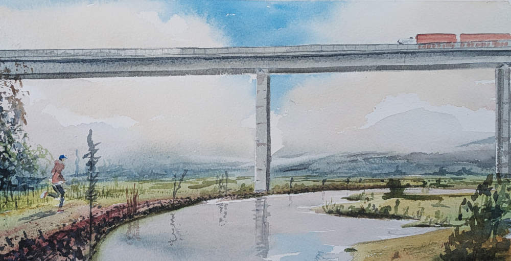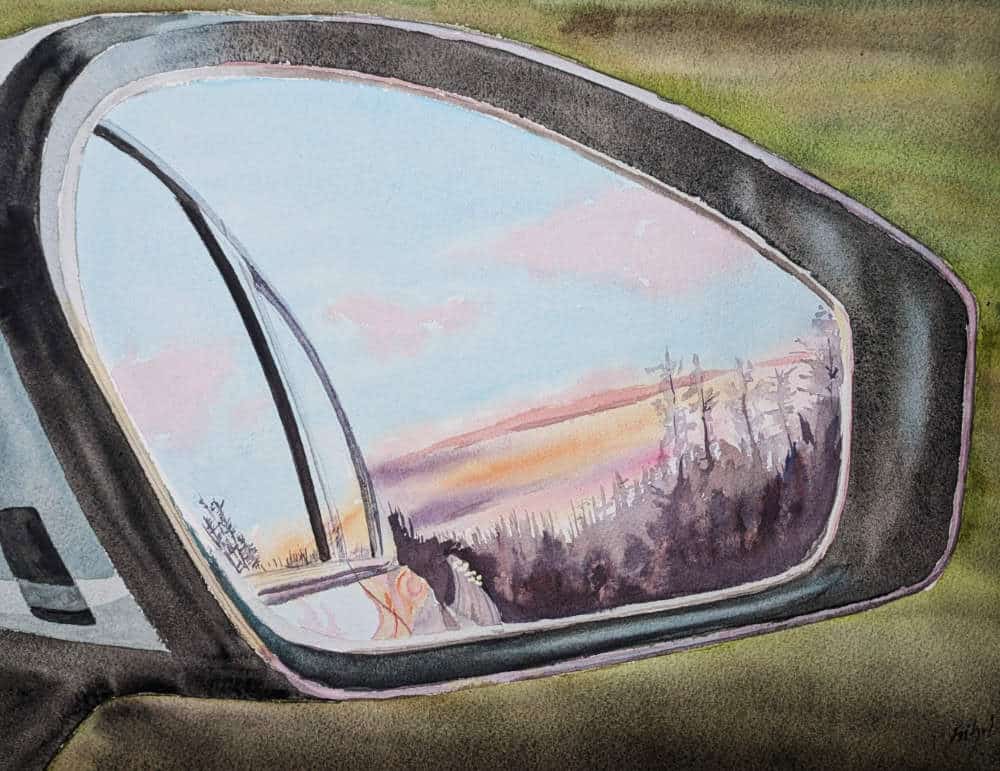 I backspegeln. Före jag började måla akvarell tyckte jag det var bortkastad tid att åka bil. Det är klart att jag förstod att man behöver transportera sig. Men nu njuter jag av att sitta bredvid föraren. Jag ser motiv överallt. Mått: 30×40 cm. Pris 3900 kronor.